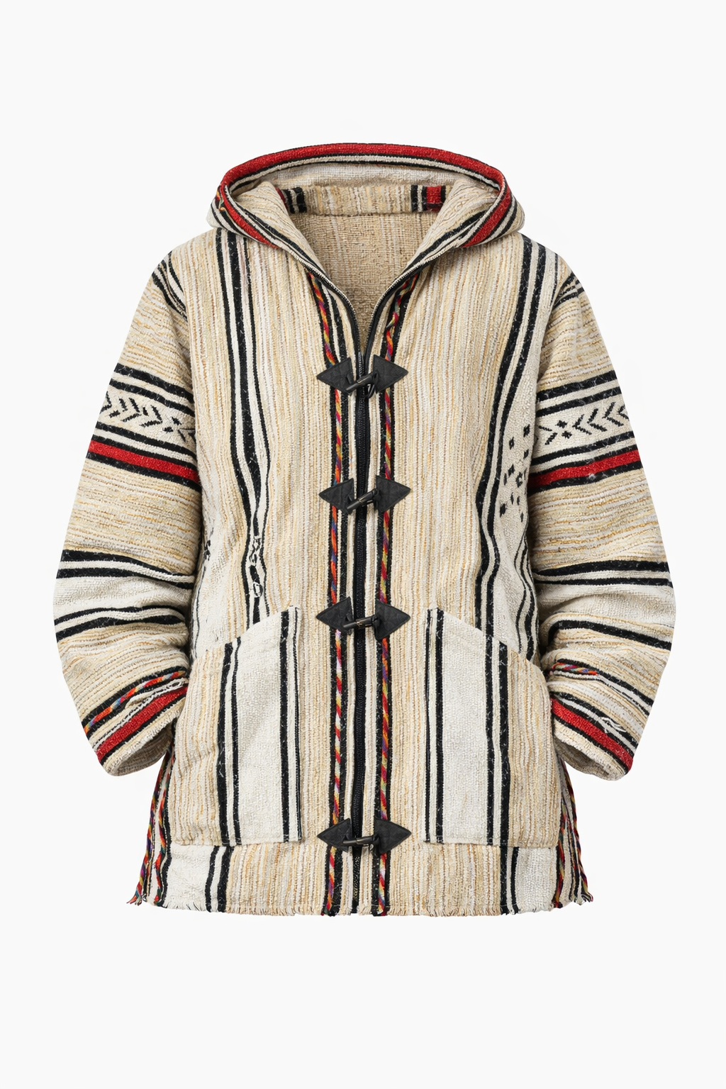 Featuring a generous hood, wooden toggle buttons, and a functional kangaroo pocket, this jacket blends authenticity with practicality. No two pieces are exactly alike — subtle variations are a testament to its handcrafted nature.